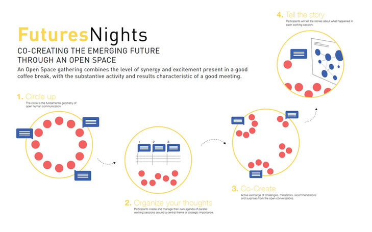 The main formats for the Futures Nights gatherings had been the Open Space technology and the World Café methodology. An Open Space gathering combines the level of synergy and excitement present in a good coffee break, with the substantive activity and results characteristic of a good meeting. The World Cafe methodology (TWC) is a powerful social technology tool for engaging people in conversations that matter, offering an effective antidote to the fast-paced fragmentation and lack of connection in today's world.